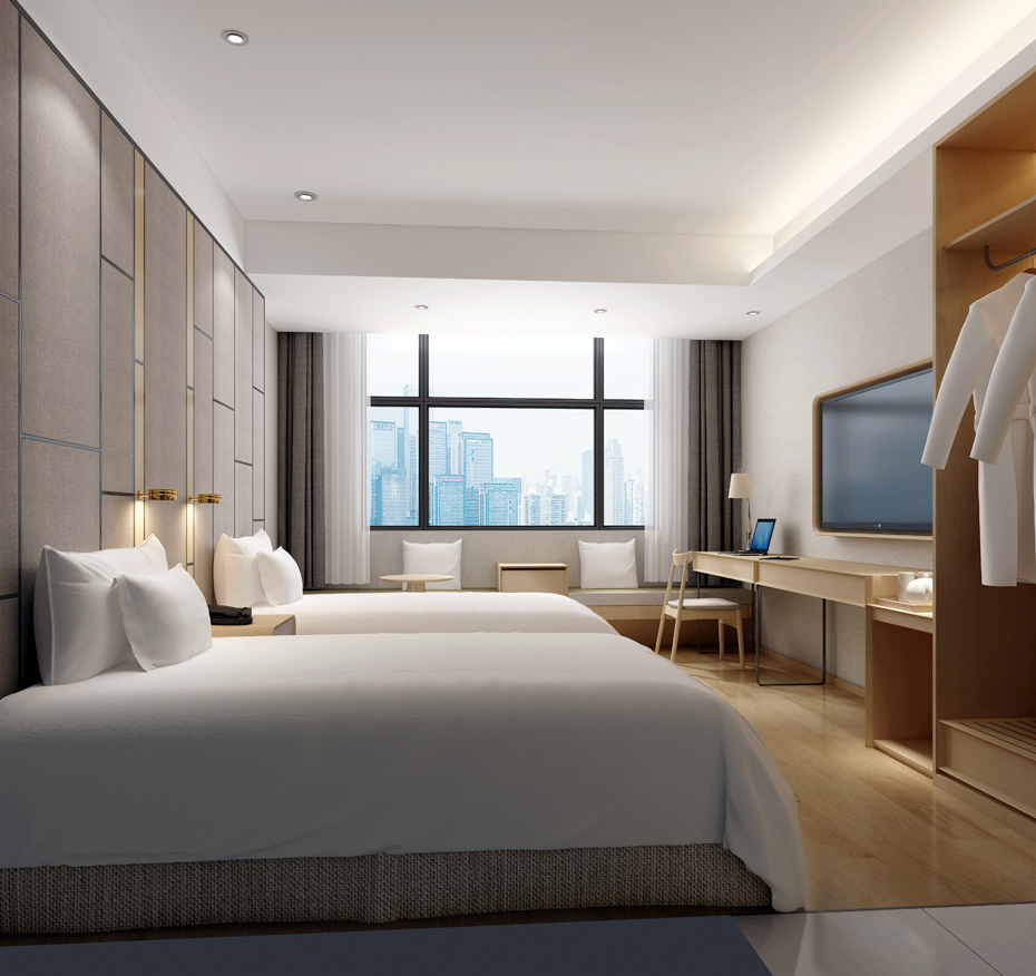 雙床房設(shè)計(jì)相對(duì)比較簡潔,整體采用柔和的暖色系的墻面和燈光,給人以舒適的安逸感。酒店設(shè)計(jì)擯棄傳統(tǒng)酒店理性冰冷的設(shè)計(jì),用木地板、淺色色家具的色彩搭配,營造出一種明快、溫暖的居家氛圍。